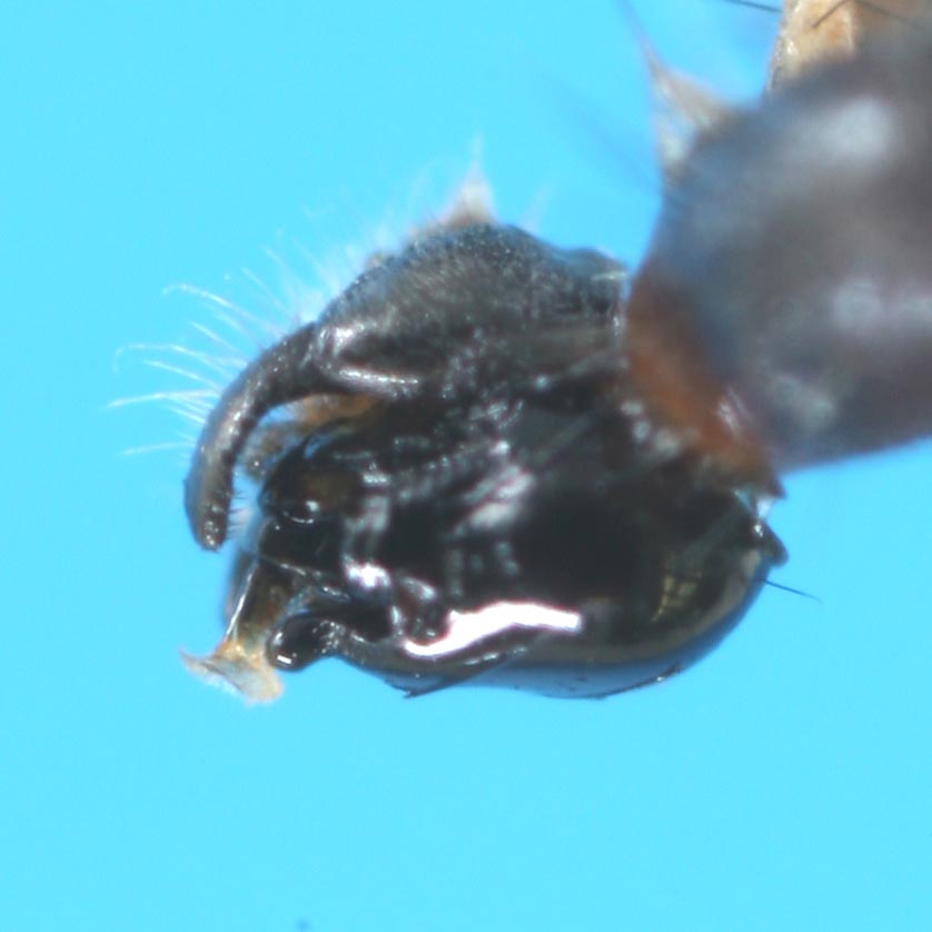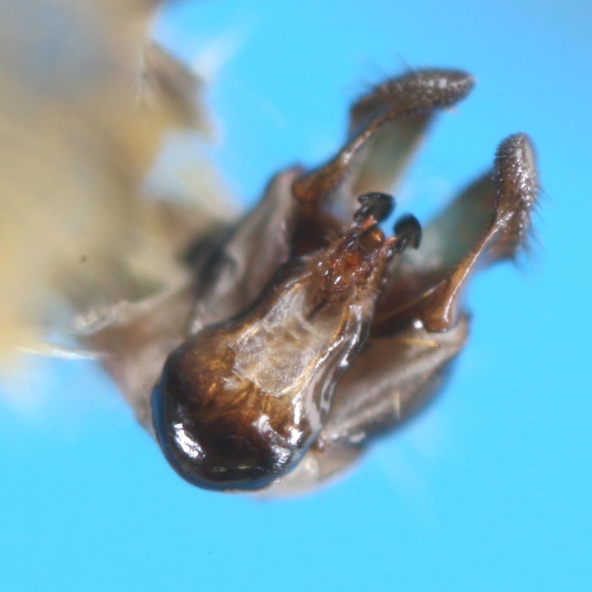 これはKeroplatus nipponicus Okadaだと思います.私のところには本種やK. biformis Okadaの既知種の他に2種未記録(未記載)の種が生息しています.そのうちの1種は本州中部からのもので,雄交尾器のgonostylus基部の突起がD. nipponicusのように細長くなくて,幅広い板状,もう1種は全身黄褐色でgonostylusが著しく細長いものです.写真で見る限り,背面として示されている交尾器の写真では,gonostylus基部の突起が細長く見えます.この点からD. nipponicusかと思います.しかし,この構造は見る方向でやや形状を変えますので,標本を解剖して検討する必要があるでしょう.なお,D. biformisは初めD. testaceusのformとして記載されたものですが,ヨーロッパのtestaceusとは別種です. おそらく,D. nipponicusの生態の記録はないと思いますので,是非論文にして発表されることをお薦めします.