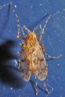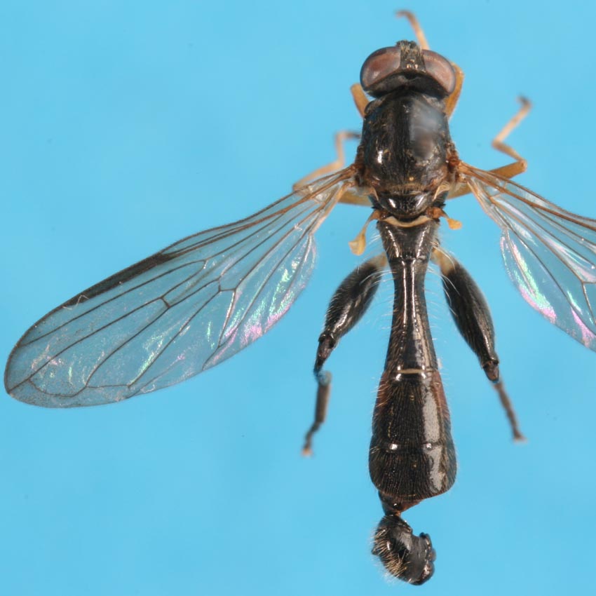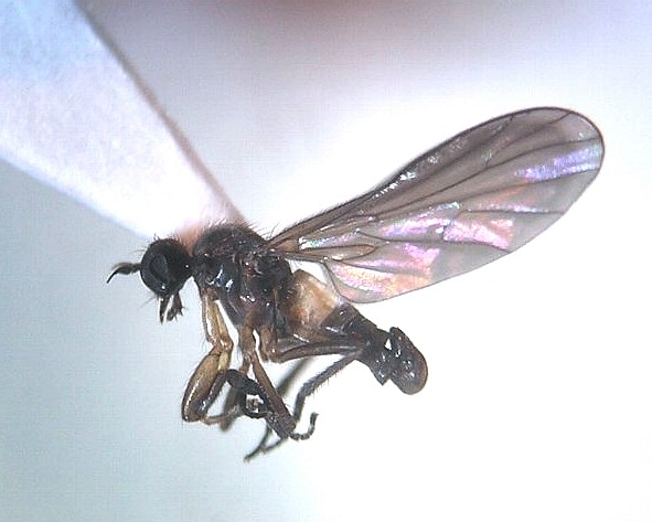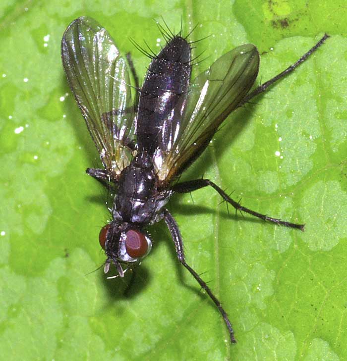 先日、このハエを「アシナガヤドリバエの1種(Phyllomya sp.?)」としてココログhttp://wolffia.cocolog-nifty.com/blog/2008/07/phyllomya_sp_cb4d.htmlに掲載致しました。御笑覧下さい。