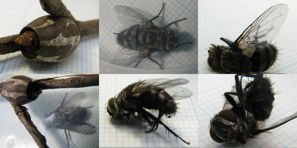 Phasiinaeヒラタヤドリバエ亜科ではなく,Dexiinaeアシナガヤドリバエ亜科の仲間でPhyllomya属ではないかと思います.(図鑑に出ているコンボウナガハリバエTorocca mundaもDexiinaeです.) Phyllomya属だとすると,手持ちの標本は,3+3 dc,1+1 stplで腹部に白色微毛を欠くのでPhyllomya nobilisと思われましたが,Mesnilの論文を殆ど持っていないので詳細が良く判らず放置してあります. もっとも,Mesnilの論文自体がドイツ語で各部の詳細が記述されているだけだと思いますので,これだと決めるのはかなり大変です. 双翅目関連の論文では,外形が図示されることは非常に稀です.♂交尾器が図示されていれば良いほうで,文章から形態を読み取らなければなりません. 時には,○○に酷似するが下記の点で異なると書かれていることもあり,正しく同定された○○の標本が無いと完全にお手上げです.