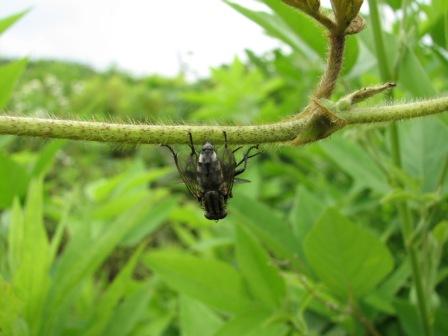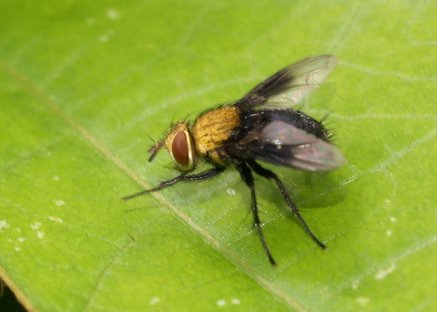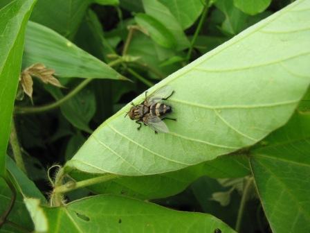 この地味な色合いと背中の三本線は、ニクバエ科のような気がします。虫がもっと大きく鮮明に写っている画像であれば、もう少し確信を持って言えるのですが・・・この画像からは「おそらくニクバエ科のハエであろう」としか言えません。