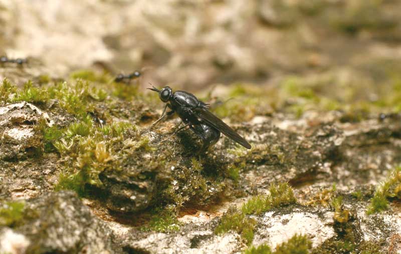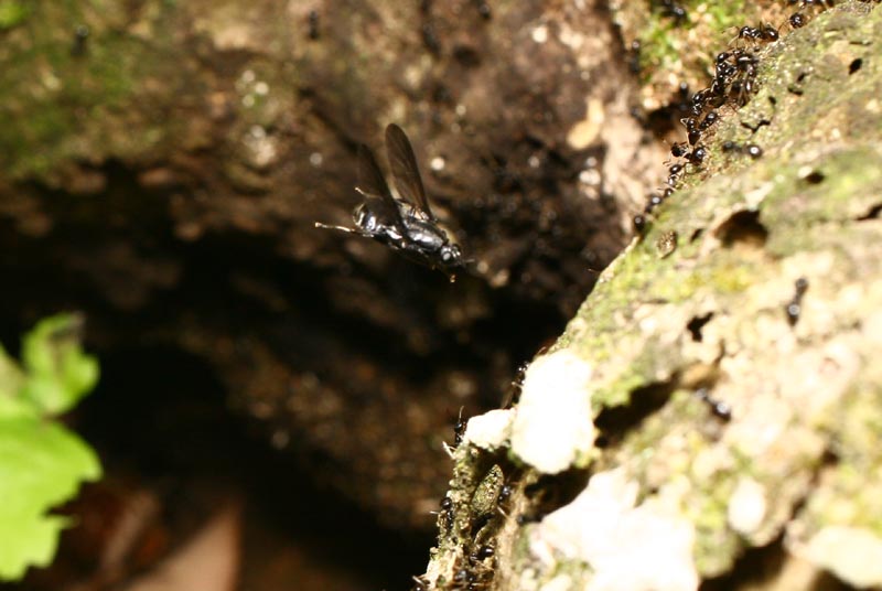 Acleris様の御指摘どおり,ハラビロミズアブです. 「はなあぶ」に下記のような報文が出ております. No.5 宮谷秀明 アリの巣に飛来するハラビロミズアブについて No.9 宮谷秀明 ハラビロミズアブの幼虫の生態と産卵について