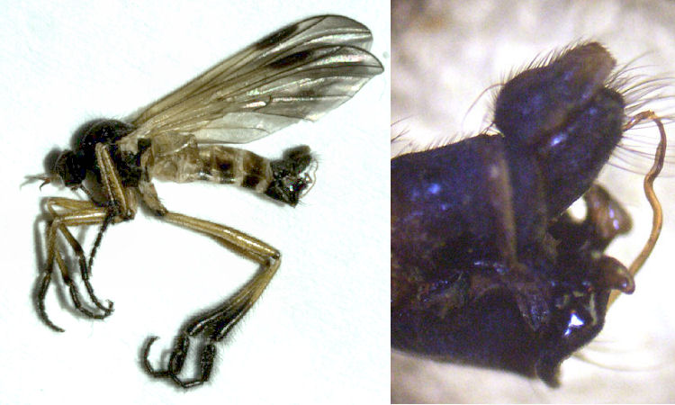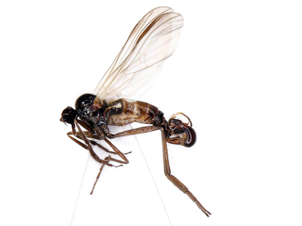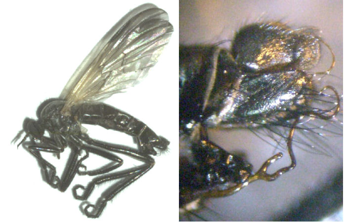 同定されたとおりHilara melanogyne Freyの雌雄です.第3触角節(第1鞭小節)が赤みを帯びることが大きな特徴ですし,複眼もやや赤みがあります.