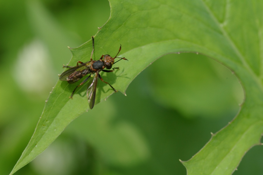 本種の配偶行動は私も全く観察したことがありません.雄が夕方暗くなり始めてから林道の2−3m上空をやや群れて飛翔したこと,午後4時ころ渓流の縁の高さ1-2mのところを数頭の雄が疎らに飛翔していたこと,位です.この点,Hilara neglecta Freyの雄の採餌行動,群飛行動,交尾行動,求愛餌の種類などかなり詳しく観察しているのとは対照的です. 多数発生しているのなら,是非観察されて,おおよそのことでいいのですから,「はなあぶ」誌上でも発表してみてください. なお,複眼が赤みを帯びるHilaraは日本にこのほかの種群で数種ありますが,これらの多くは日中の一般的活動は観察されず,採集も渓流沿いの岩陰から,キノコバエ類が飛び出してくるように,採集ネットの動きに驚いて飛び出し,採集されるものです.これらの多くは複眼だけでなく,体色も一般に淡色です.しかし,体色が橙色であっても昼間活動性の種もあります. Hilara melanogyneも上記の種のように昼間岩陰から飛び出してくる(特に雌は)個体が多いようです. なお,北アルプスなどの山地(1,500-2000m)には本種に似て,雌の翅が幅広くなり(色彩は本種同様黒褐色),雌の腹部が白色を帯びた別種が生息し,これは昼間に群飛をするようです.雌の腹部が白っぽいのは他にH. leucogyne Freyと言う種があります.これは小楯板剛毛が4対より多いので区別できます.