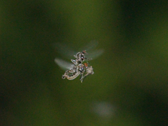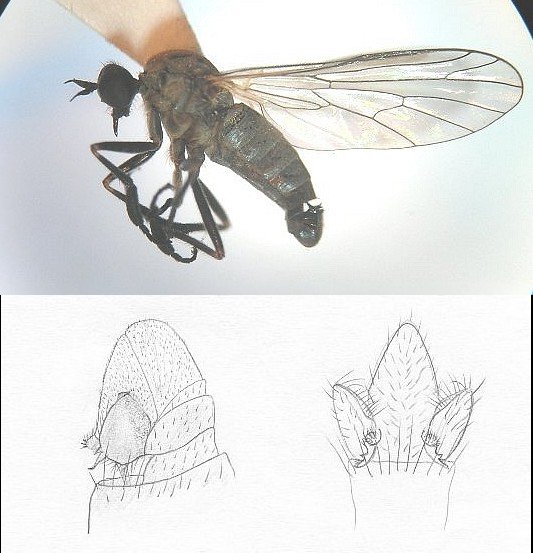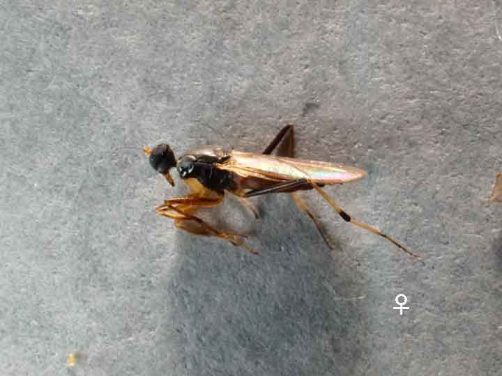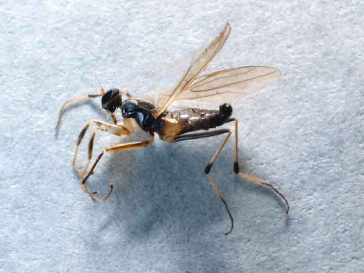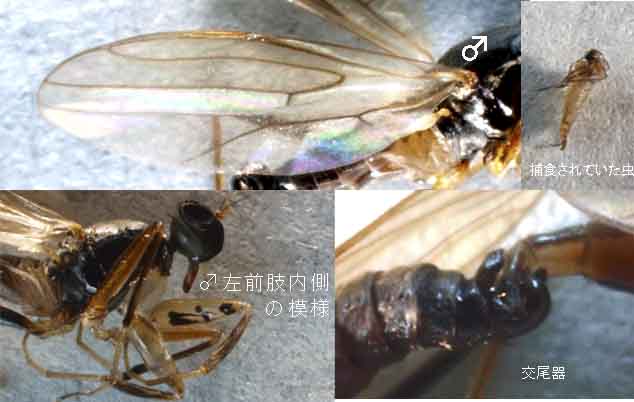 これはオドリバエ科のTachypeza fennica Tuomikoskiクロテンカマアシハシリバエです(研究者によっては別科Hybotidaeセダカオドリバエ科を建て,これに分類します).北隆館新訂原色昆虫大図鑑第三巻,p.407に解説があります.餌は写真だけでは良く分かりませんが,複眼が大型であるらしいこと,腹端の形状,大きさから勝手に判断しますとSciaridaeクロキノコバエ科の1種の雌ではないでしょうか.