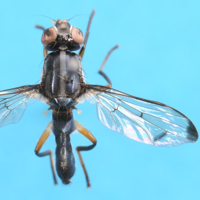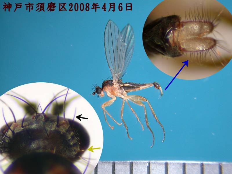 ツマグロホソナガヒロクチバエElassogaster hilgendorfiに一票. (see はなあぶ 17:1)