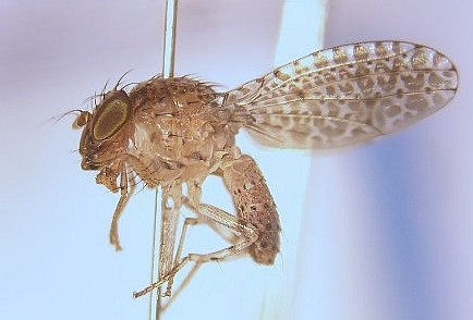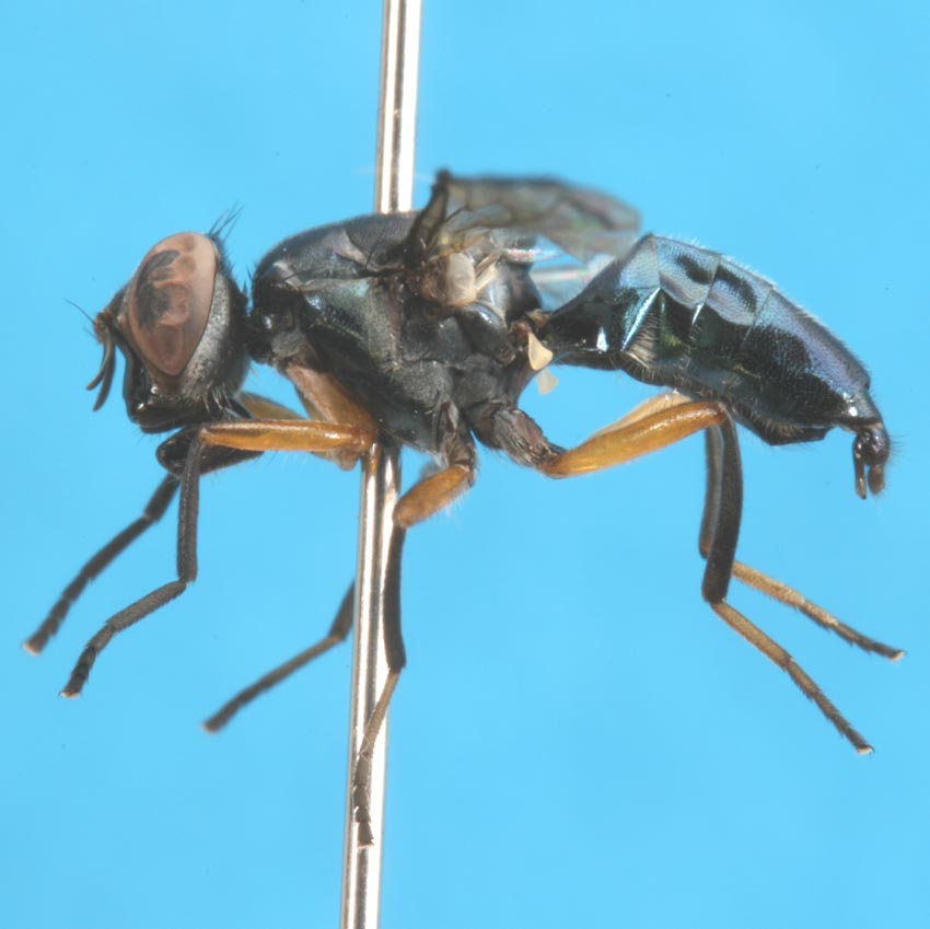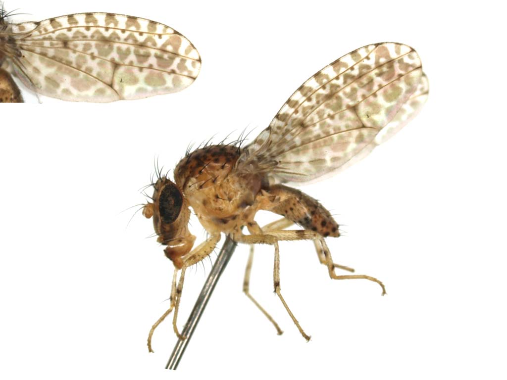 R脈基部の背面は小剛毛に覆われない(R1脈はh脈より先端で小剛毛に覆われる) ↓ 前腿節には顕著に発達した剛毛はない ↓ postfronsは中央部に瘤を持たない;触角は顔より長くならない;上前側板(中胸側板)剛毛は存在する ↓ 眼縁剛毛を欠く;mesoscutumは縦長で両側は平行;M脈は翅の先端部で前方に曲がる;翅の斑紋は単純で通常先端部に暗色の紋、横脈ごとに暗色の着色、subcostal cellには暗色の縁紋がある ↓ Elassogaster