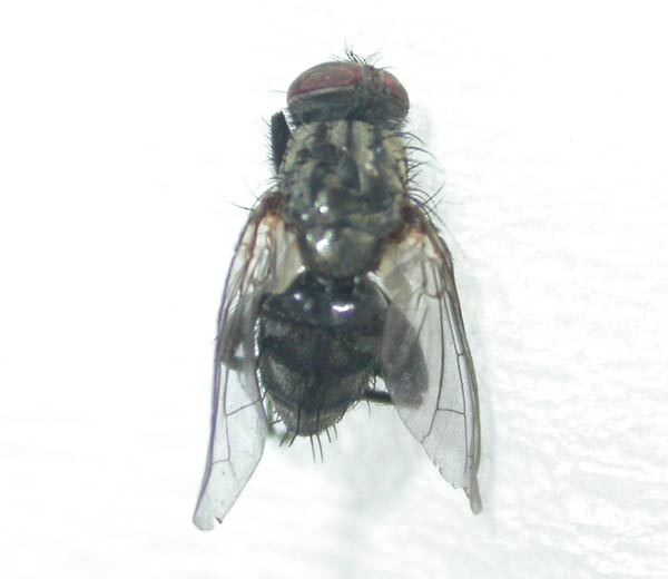 恐らくヤドリバエ科でコオロギなどに寄生する夜行性のハエではないかと思います.単眼がなくて,前胸の側面から腹面にかけての前面がやや膨らんで膜状になっていれば,上記のようなヤドリバエ科の1種だと思います.私はヤドリバエ科は専門ではないので詳しいことは分りませんが,上記のようなことを専門家から聞いたことがあります.これらは良くライトトラップに飛来します.また標本にした時に油が良く滲み出してきます.