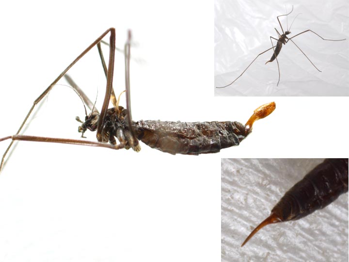 そもそも松村松年先生がこの仲間の和名が付けられたころはそれまで名無しだった様々なグループに(図鑑の出版の都合)大急ぎで和名を付けなくてはいけなかったと想像できます。ガガンボ型類(ガガンボの形をした虫たちという意味、今即興で作った言葉、ガガンボ科の近縁でないグループも含みますので誤解のないように願います)をみても四苦八苦している様子が見て取れます。ガガンボ科の中にナミガタガガンボモドキという和名を持つものがいたり(ガガンボモドキという和名はご存知のように長翅目の一群の和名として使われていますね)、ちょっと後ですがTanyderidaeにガガンボダマシ科という和名が付けられたり(これは後にニセヒメガガンボと言う和名に変えられています)など。ガガンボ型類の科に用いられている和名を挙げるとガガンボモドキ(長翅目)、ガガンボ、シリブトガガンボ、ヒメガガンボ、オビヒメガガンボ、ニセヒメガガンボ、コシボソガガンボ、ガガンボダマシ。正しい知識のない人には混乱のもとのように思えます。その上、頭が痛いことに、こうした科名を種の和名の語幹とすると、どんどん和名が長くなってゆきます。コゲチャトゲフチオオウスバカミキリとかオガサワラチビヒョウタンヒゲナガゾウムシ、ホンシュウオオイチモンジシマゲンゴロウのような長い名前はできれば避けたい。何とかしたいところです。 キリギリスの仲間のカヤ「キリ」、ヒメ「ギス」のようにタケウチ「ンボ」とかカンキツ「ガボ」とかって名前にできないものでしょうかね・・・いや、これは冗談。 >写真メスのほうの産卵管らしいものは、とがっているのとそうでないのがあります 産卵管の先に何かくっついていませんか?毒ビンの中で産卵し、卵を産卵管にはさんだまま標本になるなんてこともよくあります。