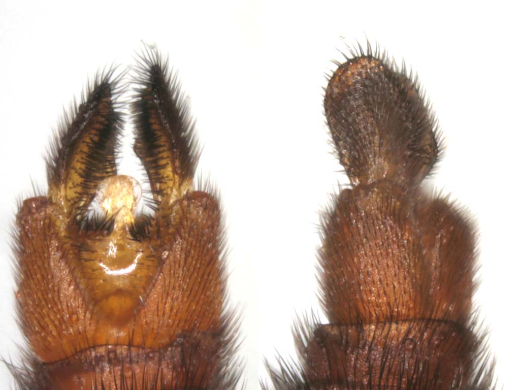おーやぎさんから標本を送っていただいて,雌の腹の先を顕微鏡でみたところ,膨らんでいる個体は,どういう原因か分りませんが,羽化の時の蛹の産卵管のクチクラが折れて,成虫の産卵管の先に付着したままになっていたようです.雌はそれでも産卵しようとしたのか,産卵管の間に1個の卵が挟まれていました.恐らく羽化したときに産卵管の部分が蛹殻から抜けないので,腹部全体の蛹殻を成虫の腹部につけたまま(頭部や胸部は先に脱げるので)走っているうちに,密着している産卵管の先の脱皮殻だけが成虫の産卵管についてままで,他の部分が破れて落ちたのではないかと,そのいきさつを推定しています.