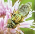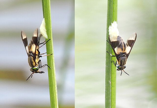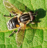 Mesembrius peregrinusシマアシブトハナアブの♀個体です. 通常型と暗色型との中間的な斑紋です. |