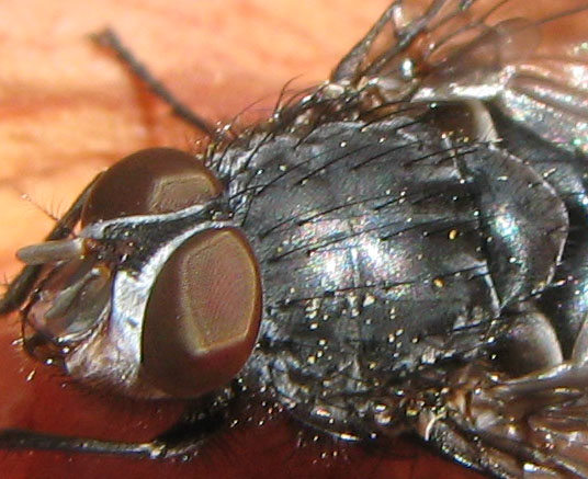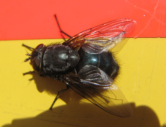 この画像は拡大すると胸部の剛毛配列がきれいにうつっていますので、同定可能でした。(ケブカクロバエになります。)