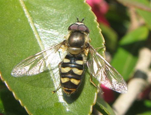 ハナアブ勉強中のpakenyaといいます。よろしくお願いいたします。 画像のハナアブは、複眼が密に細毛で覆われており、腹部の模様も青味のある光沢を有しているので、クロヒラタアブ属Betasyrphusに間違いありません。ですが、この属にはクロヒラタアブB. serariusとニッポンクロヒラタアブB. nipponensisの2種があり、互いによく似ています。確実な同定には♂の交尾器を見なければいけません。♀の場合、小楯板の基部の毛の色で区別できるようなのですが、美しく撮られているこの画像でも、毛の色まで識別できませんね。