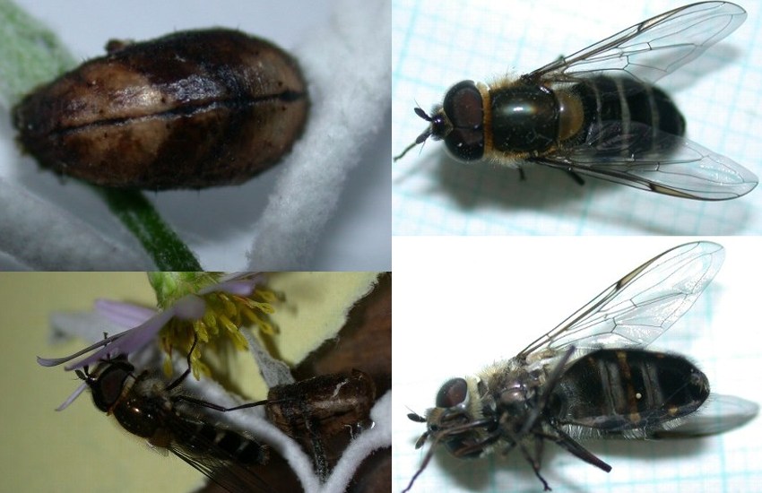 恐らく,御指摘どおりクロヒラタアブで良いと思います. 本種に酷似したニッポンクロヒラタアブは,♂腹部末端の交尾器が http://homepage2.nifty.com/syrphidae/tribe/syrphini.htm のような指状になっています.