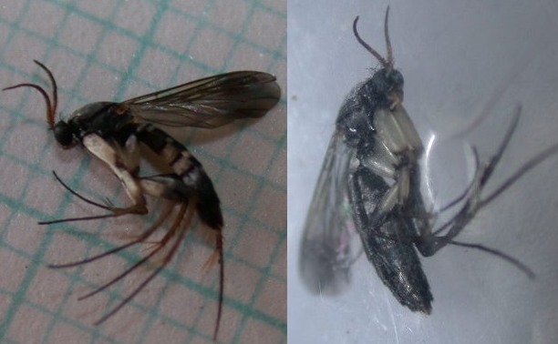 キノコバエ上科(クロキノコバエ上科)Sciaroideaは翅脈相,脚の刺毛配列,翅膜上のミクロトリキアの配列などで科を分類しますので,これらの特徴が分らないと本来は同定できません.しかし,これまで見た種の概観からおおよその見当はつきます.