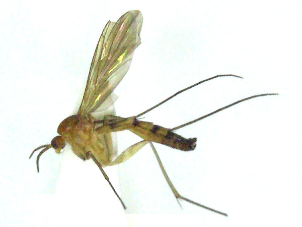 写真のキノコバエは右翅の亜端部近くにR4脈が短く分岐していることからKeroplatidaeツノキノコバエ科で,その中でもOrfelia属群に入ることは頭部や胴部の概観から見当がつきます.この属群には10属ほどあって,これらのいずれかに入るかはこの写真では分類形質が全く見えないので私には困難です.