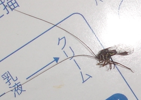 シワバネキノコバエ(新称)Allactoneura cincta de Meijereというキノコバエの1種です(学名の3番目のdeは亜種名ではありません.de Meijereがこの学名をつけたオランダ人ー命名者ーの名前です).翅を縦に畳むことのできる大変珍しい性質をもっています.キノコバエと言っても,この種はキノコではなくて,専ら腐敗した植物質(野菜や果物の腐ったもの,野積みして腐った枯れ草などなど)を幼虫が食べます.熱帯系のキノコバエで,恐らく寒冷地では越冬できないで,温暖地から渡って来る可能性が考えられます.というのも,前日まで全く見かけなかったのに,突然ある朝庭の草や木の葉にいくつも静止していることがあるからです.