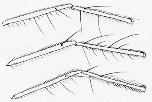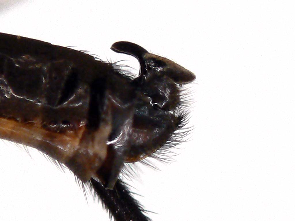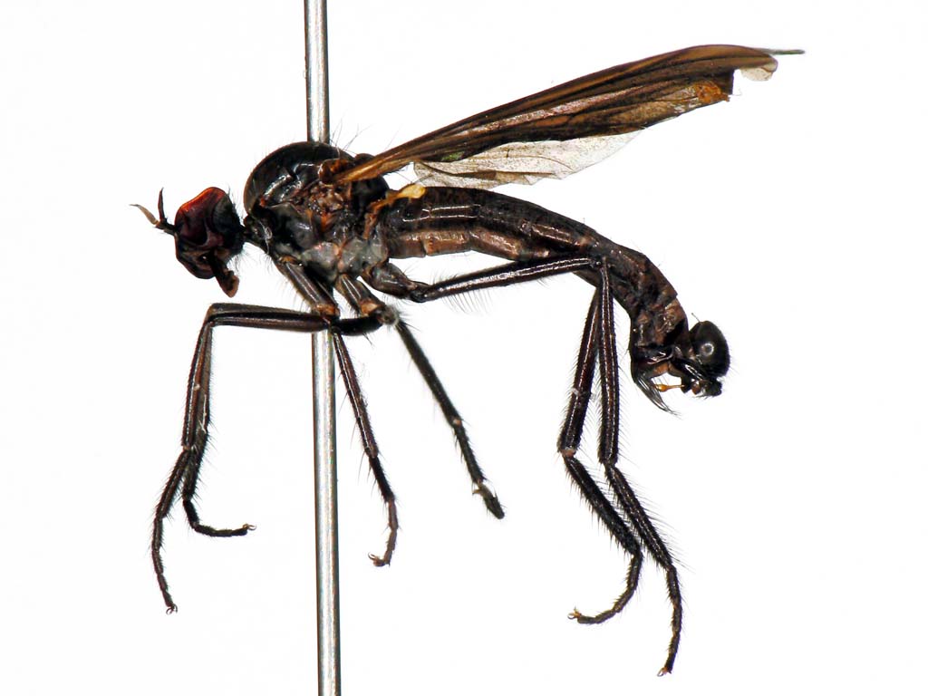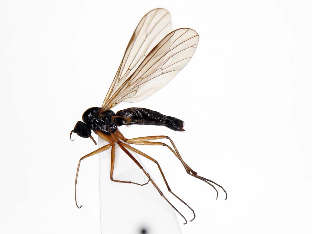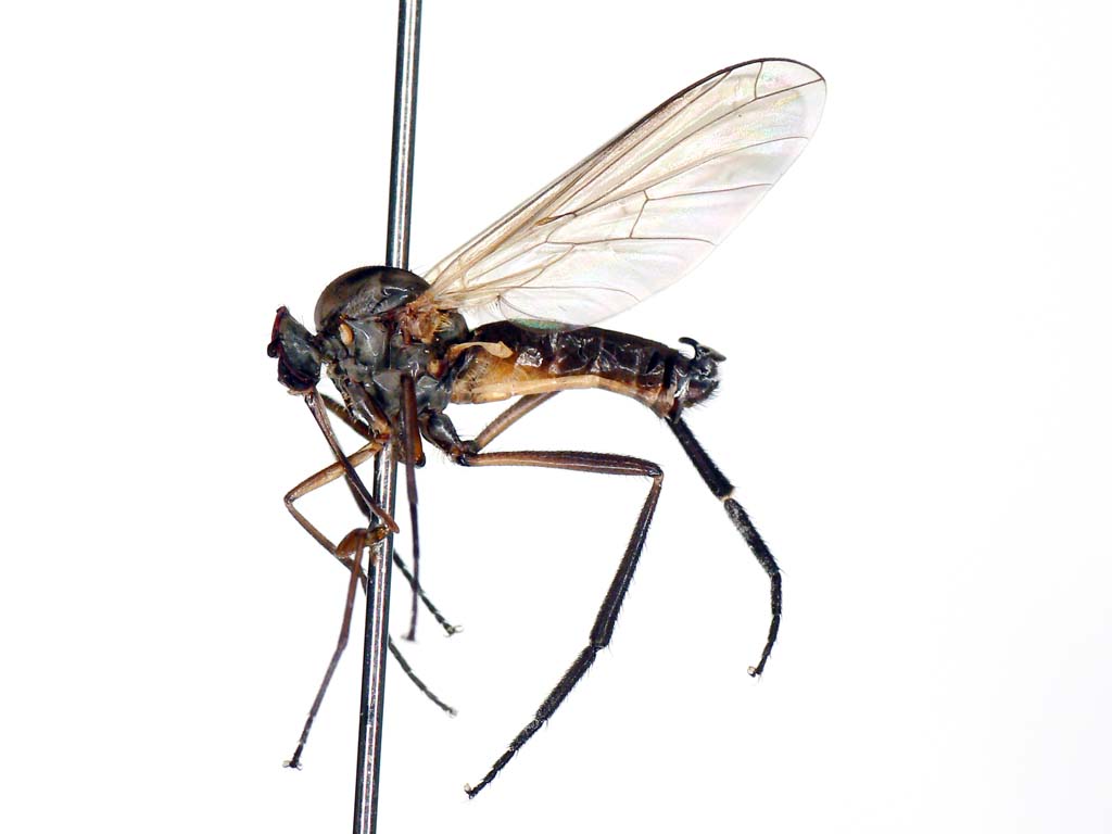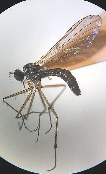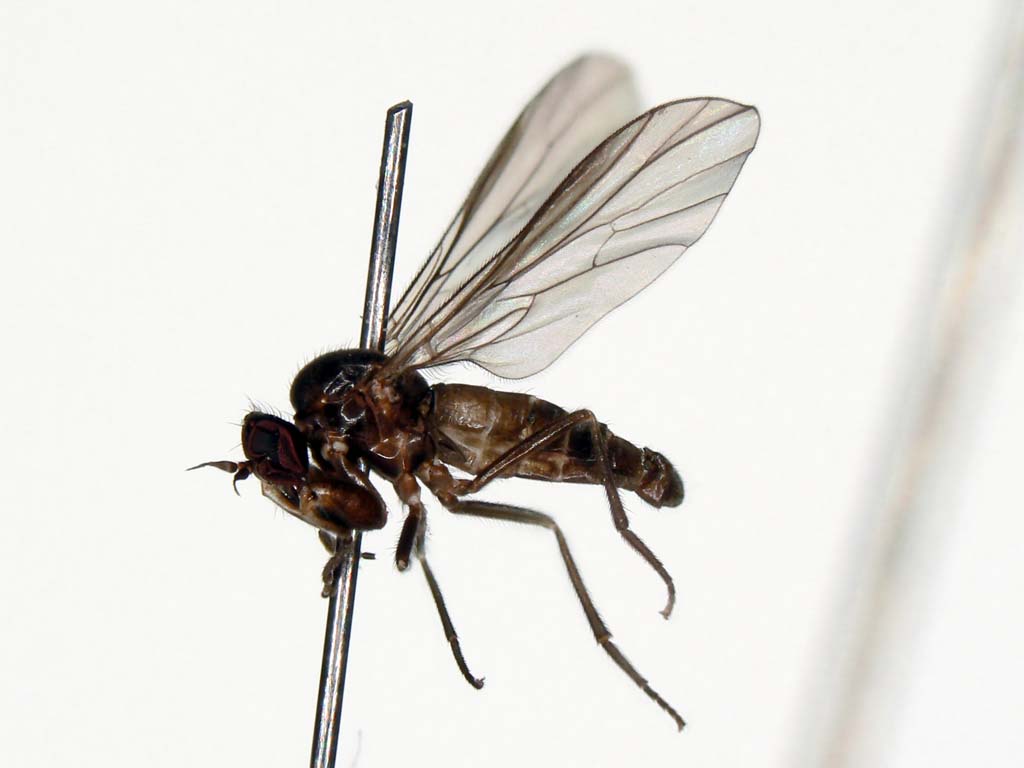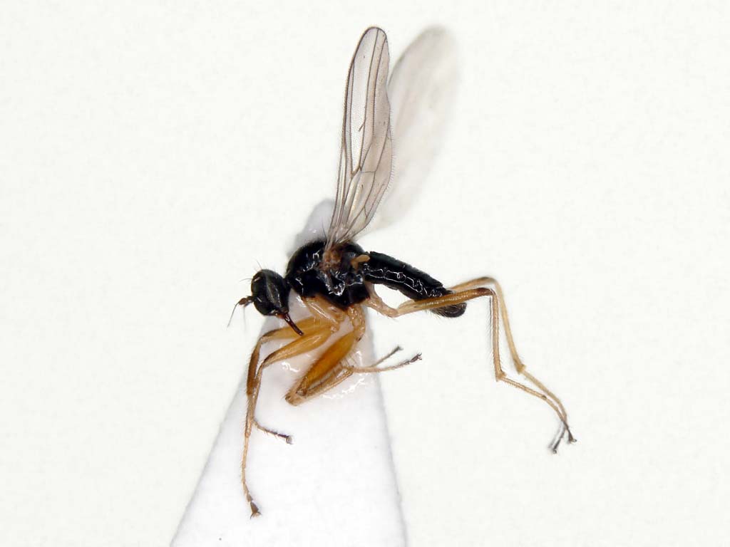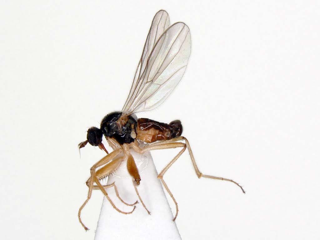 日本にはPlatypalpus属の種は60種以上棲息しています.既知種はPlatypalpus itoi Frey1種のみです.これらは頭頂部の刺毛,触角第3節の形や色,胸背の刺毛配列,中腿節の形と腹面の棘,翅脈相,などをもとに分類されています.もちろん♂交尾器は決定的です.ベルギーのGrootaertさんが一緒に研究できないかと言ってきていますが,私の材料も全部は整理し終えていませんので,直ちに研究に着手できる状態ではありません.せめて普通種だけでも一先ず名前をつけなければとは思っています.それで,今回の写真の種について決定的なことが私には言えません.