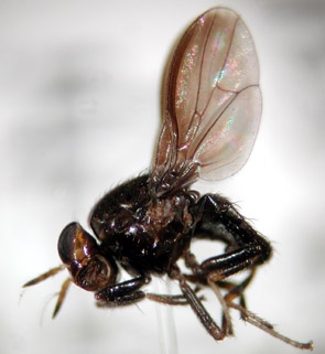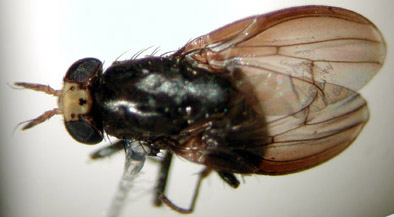 これは以前に笹川満廣先生が確か京都から記録されたシマバエ科Lauxaniidaeの1種ではないかと思います.学会で発表されたのか,論文として発表されたのか,記憶が定かではありません.翅が甲虫のように腹部を覆うように曲がっているものだと思います(ショウジョウバエ科のSteganaカブトショウジョウバエのように).あまりはっきりした回答にはなりませんが,どなたか上記笹川先生の記録をご存知の方があったら詳細を示してください.いずれにしてもそれほど普通の種ではありません.