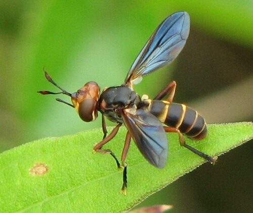 ヤドリバエ科の系統分類学者の舘博士にお尋ねしたところ,写真の種はヤドリバエ科ヒラタハナバエ亜科のHemyda属の仲間ではと思う,というお答えをいただきました.ご紹介しておきます.本属には日本から2種記録があるようですが,これらに和名は付けられていません.なお,ヤドリバエ科は種数が多く写真だけでは同定が極めて困難である,とのことです.市販の図鑑類で同定できない種の名称を写真だけでお尋ねになっても,先ず不可能ということのようです.