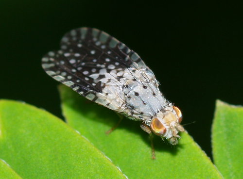 画像はヒラヤマアミメケブカミバエです。普通に見られる翅に紋があるミバエですね。 記事No.2314にもきれいな本種の画像と、よく似てるシモフリシマバエの画像がありますのでご参照下さい。 また翅に紋がある種類を見たときはバグリッチさんのサイト内に「特徴的な翅模様のハエたち」http://homepage1.nifty.com/tago-ke2/moyou-hae/index.htmにも紹介されていますので、そちらも参照されると良いと思います。