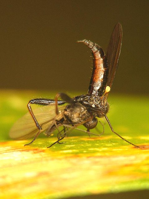 (1)前田泰生,2006,島根県産メバエ類の採集記録,すかしば,(54):1-6,[日本産リスト31種。島根県産15種] (2)Tanaka, A.(田中梓),1960,The List of Conopidae of Japan,神戸山手女子短期大学紀要,(5):17-24,[19種] (3)Maeta, Y. & Macfarlane, R. P.,1993,Japanese Conopidae (Diptera) : their biology, overall distribution, and role as parasites of bumble bees (Hymenoptera, Apidae),Jap. J. Ent.61(3):493-509 (4)Smith, K.,1969,Handbook for the identification of British insects, Diptera Conopidae,,18pp. メバエはハチに寄生しますが、なんと飛んでるハチの腹部に直接産卵するのだそうです。したがって宿主のハチがいるところでないとなかなか得がたい、とのことです。 「神戸山手女子短期大学紀要」ってなんでこんな雑誌にメバエの論文がのっているのだ。「田中 梓」さんって何者でしょうか?