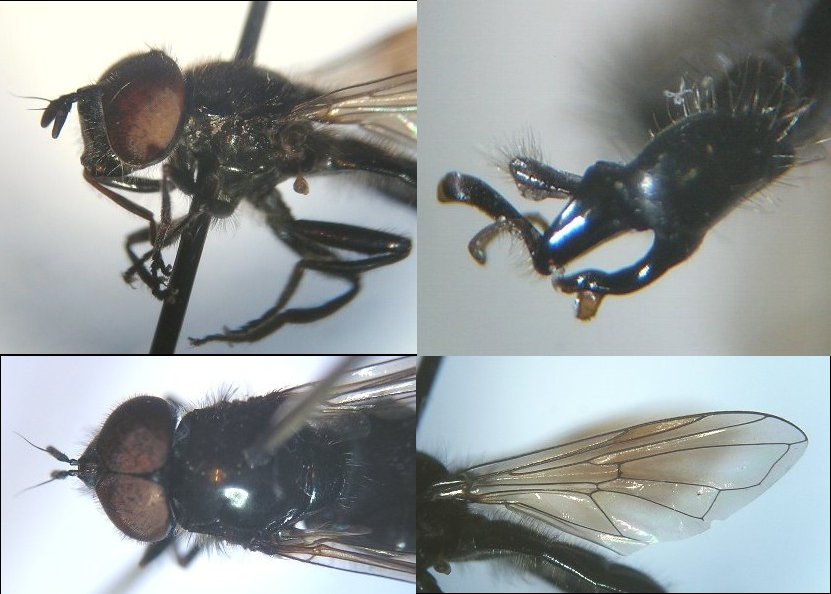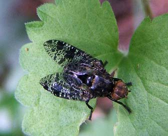ヒロクチバエ科で翅にこの手の斑紋があるのはEuprosopia属とProsthiochaeta属なのですが、画像では頭部の雰囲気はProsthiochaeta属であるように思われます。 Prosthiochaetaのレビジョンでは日本には一種のみが記録されています。