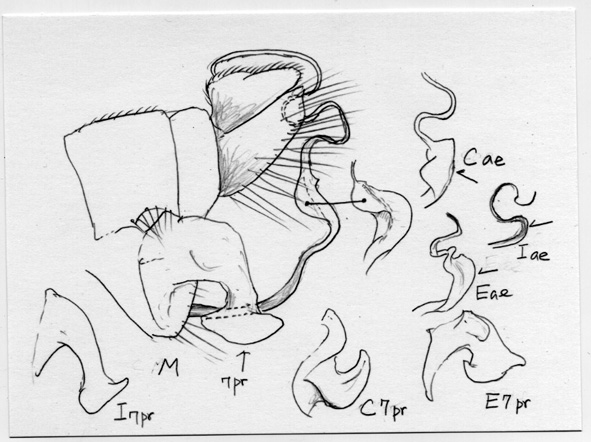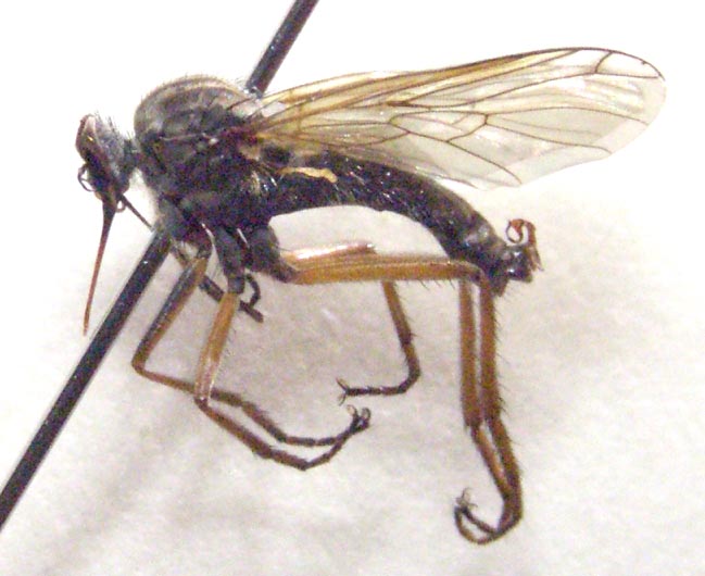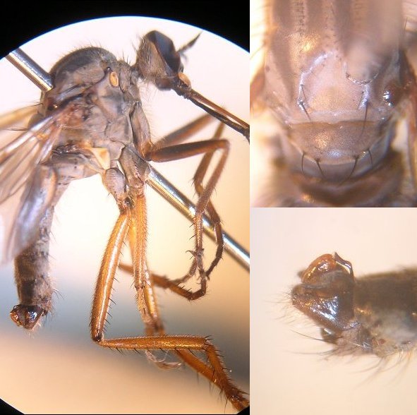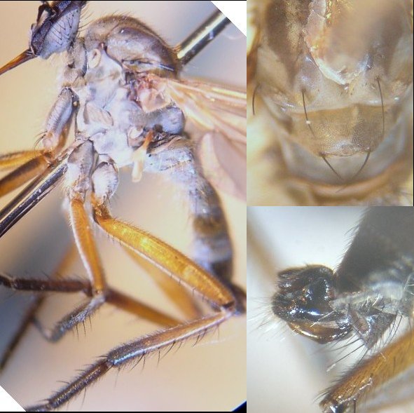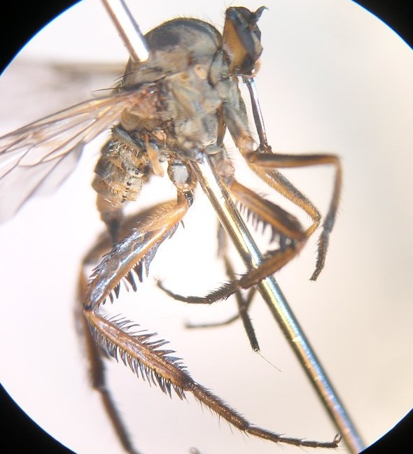 写真の種はEmpis (Polyblepharis) compsogyne Freyの雄です.三枝(平成7年)の検索表では6dで雄交尾器の尾角突起が背板葉を越えない点で6eに進み,6eでは体色が黄褐色,雄後脛節が単純,雄陰茎が強く湾曲する,でPolyblepharisに行きます.写真の個体のように筋肉を著しく収縮させる薬品(例えばクロロフォルム)で長時間殺虫処理をしますと,筋肉の硬直が死後も取れず,陰茎が強く押し出され,背板葉が内側に屈曲して,交尾体制をとります.その結果,背板葉が尾角突起より短く見えて,それが検索表の引き違いになったのではないでしょうか.下記の前の投稿の写真では正常(ほぼ同じ長さ程度ですが)です.青酸カリ殺虫では,前処理のクロロフォルム麻酔を長くやらない限り,このような収縮はおこりません.さらに注意すべきことは,このような収縮で骨化部が変形していますと,KOH処理を行っても正常の形に戻らないことがしばしばあります. 本亜属は日本列島に少なくとも6種分布しています.本種に極めて類似した別種(未記載種)が本州中部以南で同所・同時的に発生します.本種の雄は,後脚が付節を含めて黄褐色,前腿節の背面が暗色なので別種(後脚は少なくとも付節は暗色,前腿節はほぼ全面的に黄褐色)から区別できます.これら両種は本州中部以西ではしばしば同所・同時期に発生します. 個体数の多い種で,谷や沢筋の地上数mの木の枝の直下に大きな群飛群を造ります.あまりにも樹の枝直下のために,群飛に気付かない場合があります.Empisの配偶行動を観察するには最も適したものです.Nuptial giftも大きいし,pairはかなり低い位置に止まることがあり,雌がnuptial giftの昆虫を摂食する様子が観察できます. なお,昨年7月31日の投稿番号2547も参照ください.