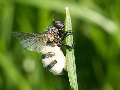 これは推察されたように,Entomophtora(エントモフトラ)というカビの1種に犯されたハエです.ハエの体内で菌が増殖し,特に腹部のような柔らかな部分は膨れ上がって内部の菌が白く見えます.特別に珍しいものではなくて,注意するとしばしば見付かるものです.Googleなどで検索してみると,さらに詳しい情報が得られるでしょう.
