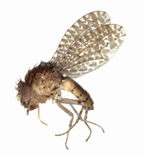 カザリコガネショウジョウバエLeucophenga ornataと思われる個体です。体長2.5mm。数日前に自宅庭のマレーズに入っていました。 一応、Okada(1988)やOkada(1990)で調べてみました。 ハエは難しいです(^_^;)
