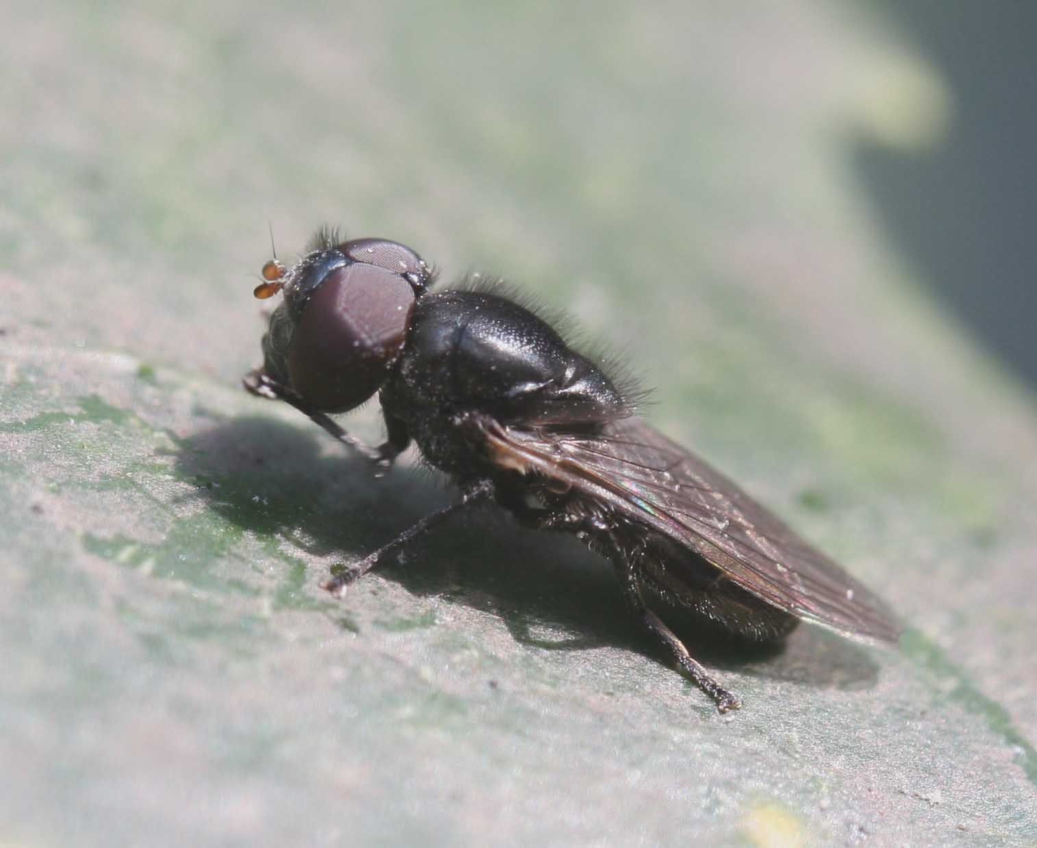 1cmぐらいとのことなので、画像を見たときの雰囲気はショウジョウクロバエというクロバエ科のハエに似ているように思えます。 ただし、これもあくまでも、雰囲気が似て見えるといった程度の話です。(信頼度50%弱くらいか?)(やはり翅脈が見えないと科の決定も正確にはできませんので・・・)
