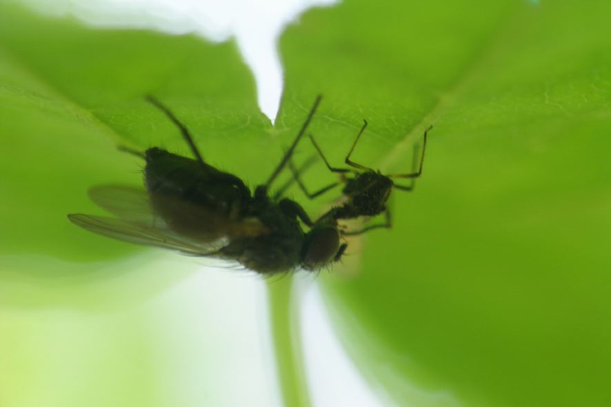 ハエにも結構肉食?性のがいます。いわゆるカマキリのように大アゴでバリバリ噛み砕くのではなくアブのように吸血(吸液)するタイプのものは結構います。