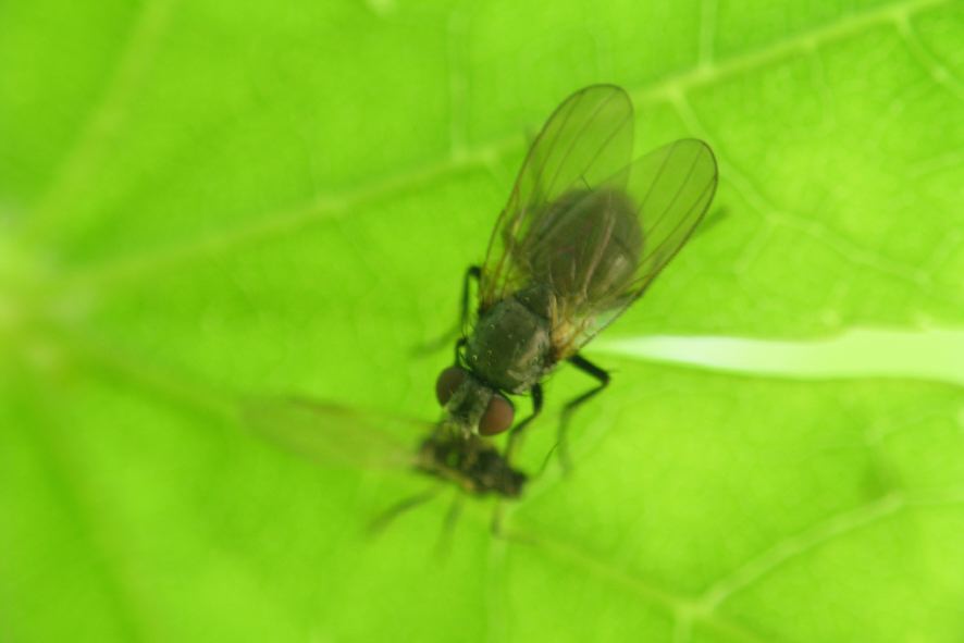 イエバエ科のハナレメイエバエ類とかハナバエ科の一部なんかで、けっこう葉上の小昆虫を捕食するのがいます。あの柔らかい口吻(下唇)の内部にとがった上唇や咽頭が隠されていて、先端から飛び出して獲物に突き刺さるんですよね。おそらく、性成熟のための卵巣(精巣もという可能性あり)発達のためのタンパク質摂取のための捕食だと思います。