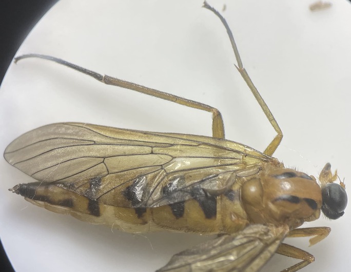 はじめまして。先日福岡の西部で採集したハエの種がわからないため、質問させていただきます。6/11に福岡県糸島市二丈でのライトトラップに飛来した個体です。 体長は15mm程度です。 よろしくお願い致します。 同定のポイントなどあればご教授いただけると嬉しいです。