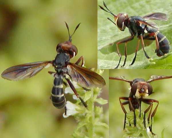 各種Webの画像で見られるものよりはやや小さめですが確かに肩部に黄紋があります。体長は11-12mmといったところです。ジョウザンメバエ Conops flavipesでよさそうですね。ありがとうございました。 |