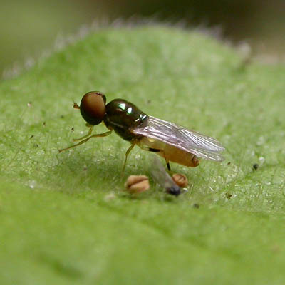 I am not sure what this fly is. First I thought it is a Syrphidae sp. because it flew like one. Than I thought maybe it is Stratiomyidae. Now I think it is maybe Pipunculidae.