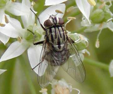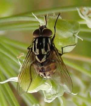 で、市毛様の紹介の「昆虫学データベース」で調べたところ、 セマダラハナバエ Graphomya maculata(Scopoli) ヒメセマダラハナバエ Graphomya rufitibia(Stein) となっていました。従って、ハエ男様に教えていただいた「ヒメセマダライエバエ」は「ヒメセマダラハナバエ」と読み変えさせていただきます。ごめんなさいハエ男様、勝手なことをしました。この後は市毛様とチャンバラなさって下さい。 有り難うございました。