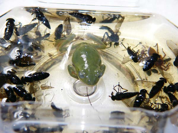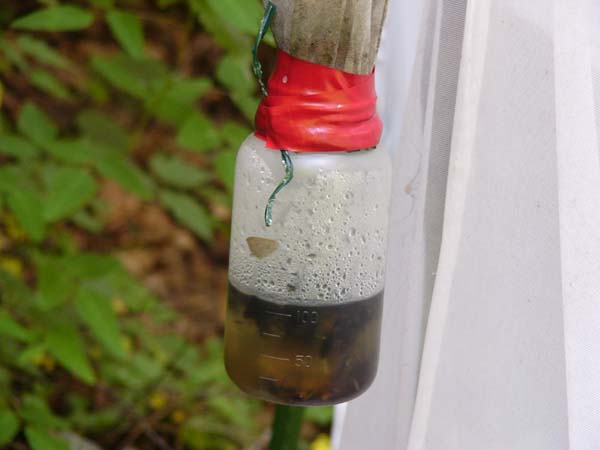 ゴヘイニクバエはエビダレ(エビ汁とも呼ぶ秘伝のたれ)に良く来ます。 海から陸に向かって風が吹いてるときが特に良く効きます。 金沢では皿に入れて3分しないうちに飛んできました。(4頭をとるのにかかった時間は40分くらいです。) とりあえず、これを置いて10分待ってこなければいないと言うことで・・・ エビダレの作り方・・・エビの甲羅(甘えびとか、クルマエビとか、イセエビ、芝エビなんでもいい)をビンにつめひたひたになるくらい水を入れます。そして冷暗所に寝かすこと3ヶ月、見事なフレーバーの液が出来ます。あとは使ったら水を補充、古くなると甲羅からのエキスが出にくくなるので適度に甲羅を追加・・・(塩入れない)・・・3年目くらいになるとにおいも熟成されまろやかになりますが、そこで、新たエビを加えてやるとまろやかさとパンチを両立させたハエ好みの液になるようです。(とりあえず、秘伝のたれ5年目に突入中)高級シェリー酒みたいに作り始めて〜十年ものくらいになったらどうなるか・・・楽しみ?だな・・・ |