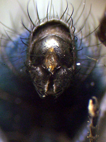 ヤドリバエ科のルリハリバエではないでしょうか。 (正確には小楯板の下の亜小楯板を見ないときついのですが・・) 剛毛が強いし・・・頭部も白い部分が多いですし・・