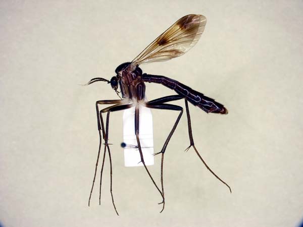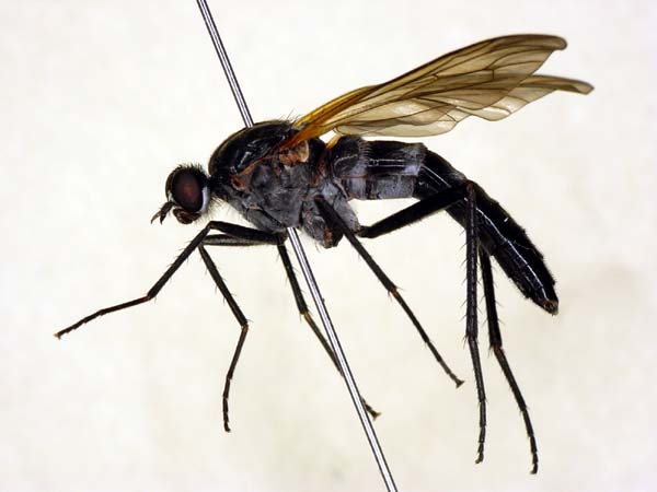 I think "Nerellisoma agrion"--- Scatopjagidae. body : 10-15mm thorax slender.& 2 Black line. fore leg: long bristle. It appears on the mountain of summer. |