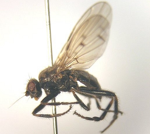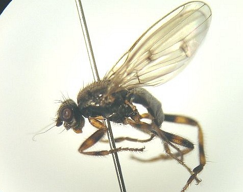 上の画像はマダラオオフンコバエCrumomyia annulus (Walker, 1849)で、下は実物を見ないと断言できませんが、おそらくヤマトオオフンコバエCrumomyia nipponica (Richards, 1964)と思います。小楯板にある2対の剛毛の間にやや長い毛が数本生えていればこの2種のいずれかで、腿節2/3のところに黄褐色のリング状の部分があればマダラオオフンコバエに間違いありませんが、この部分がたまにくすんで黒ずんでいる個体があり、その場合、交尾器の形態を見ないと判断出来ない場合があります。 日本産のまとめを書けるのはまだまだ先になりますが、前回”はなあぶ”誌に原稿を書いた際に編集部より同定の手引きのようなものを書いてほしいとの要望がありましたので、とりあえず現在までに分かっている部分について連載で解説してゆく予定です。