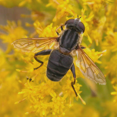 シマアシブトハナアブの黒化型=Mesembrius flavipesで