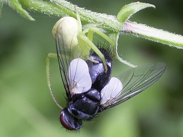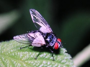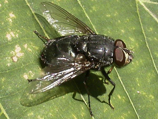 すみません・・良く見れば複眼の間が狭いですね。・・・♂の複眼の間が狭いといえばオオクロバエの特徴でしたっけ・・♀だともう少し複眼の距離が開いちゃうのでそうも言えないのですが、画像は複眼の間がほとんどゼロになるくらいくっついてますので♂です。ということで、ワシの勘違いです。オオクロバエに変更します。