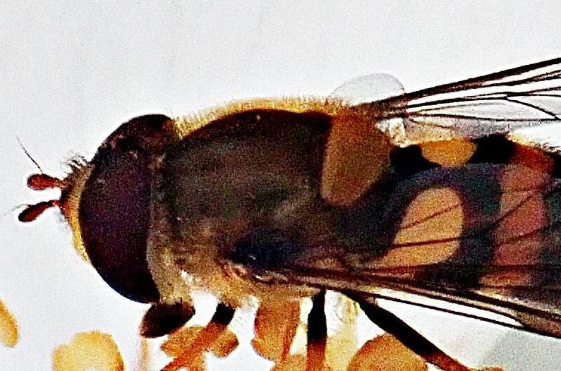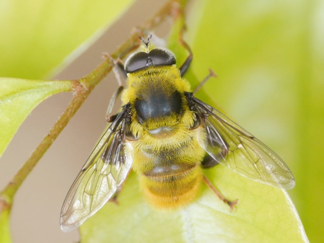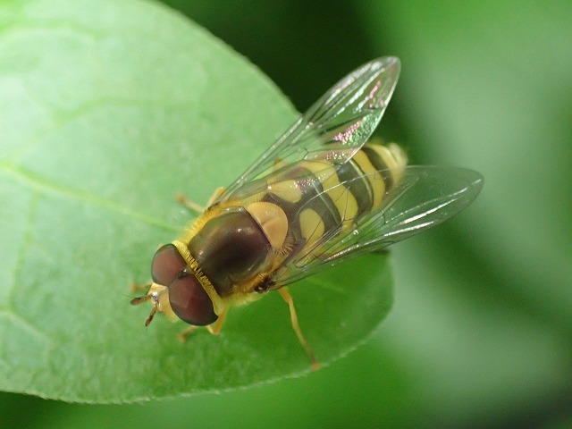 詳細なご教示をありがとうございました。 ご紹介いただいた参考サイトも役に立ちました。 ブログにアップする際はヒラタアブ属の1種として取り扱います。 複眼に毛がある種があるというのは少々驚きでした(トンボのことしか知らない者ですので)。 今後この仲間の写真をとるときは複眼をふくめ細部の接写を心掛けたいと思います。 |