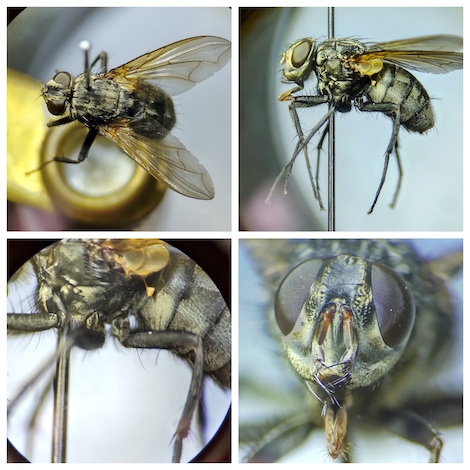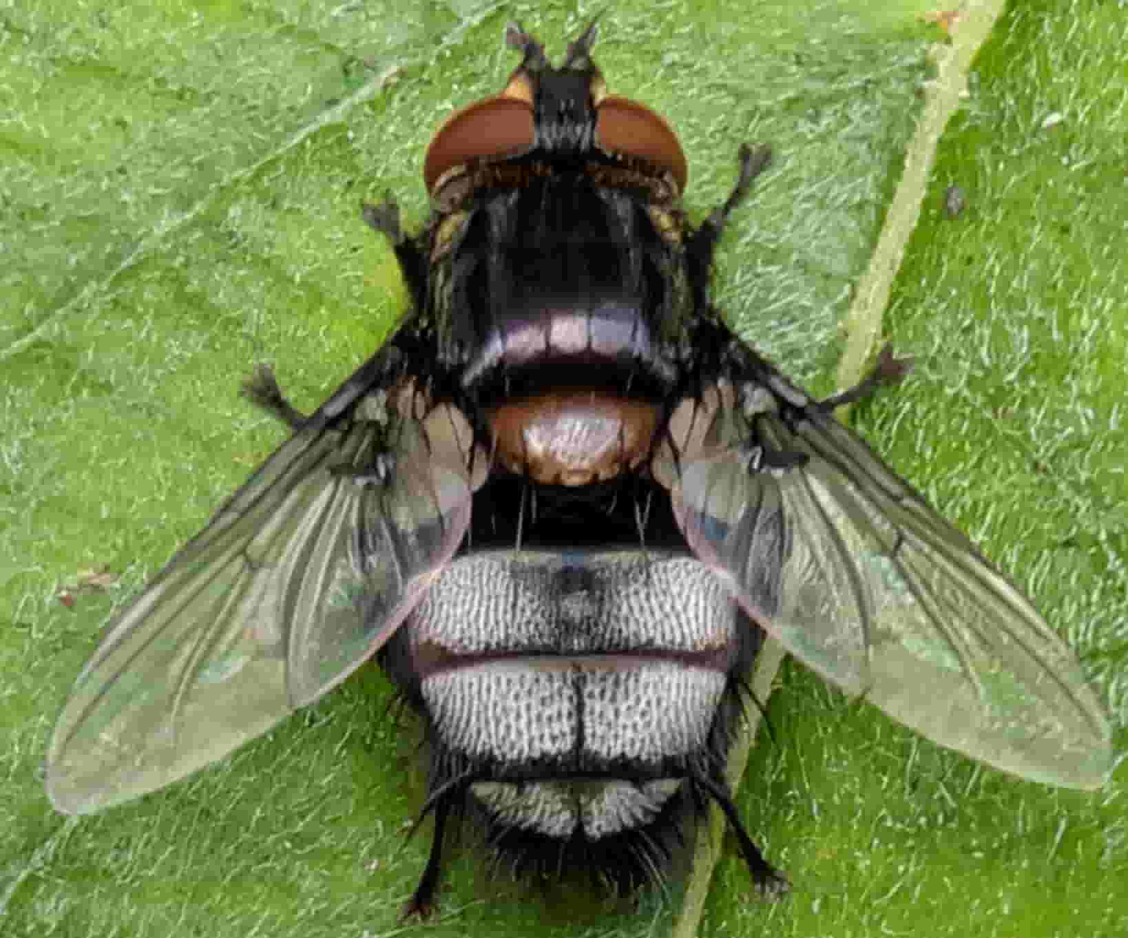 詳しく調べて頂きありがとうございました。 Googleで、検索するとカイコノウジバエを提案されたのですが、自分ではトガリハリバエに近いかと思っていましたが、何か腹部ほ形状が違う気がして、確かに虫キョロリス様の言う通りWinthemia venustaに雰囲気が似ています、虫キョロリス様の意見を参考に自分でも、もう少し詳しく調べてみようと思います、本当に、ありがとうございました。 |