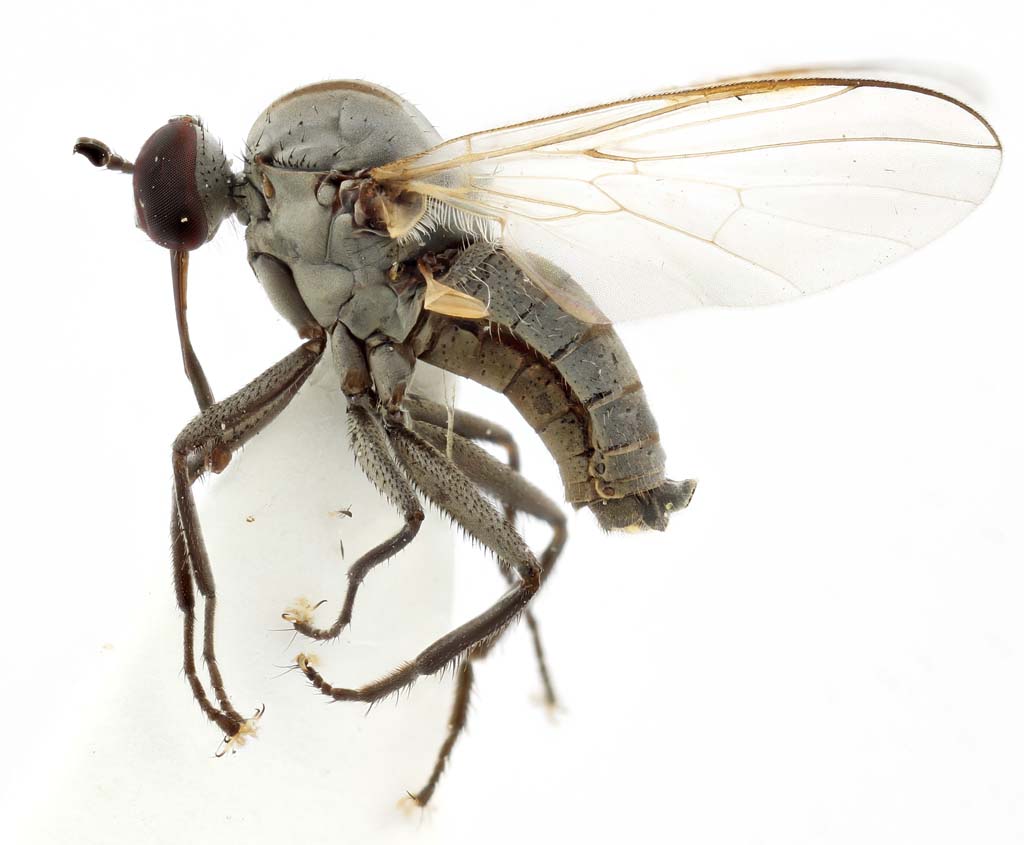 No. 10426で触れたように,Planempis亜属には典型的なPlanempisの他に,そのような交尾器に進化する段階より分化の程度の低い,あるいは分化の方向性が異なる多くの種群があります.また,一部にはR4脈を失って,検索するとRhamphomyiaに行きつく種群もあります.今回の種はRhamphomyia型の脈相のPlanempisの1群の1種です.この群は,市毛さんが書かれているように,胸部や腹部の刺毛が極めて短く,しばしば淡色(市毛さんが表現されているように銀色にも見える)で,一般的に雄後頭部側面や胸部のnotopleuronの縁の刺毛が鱗型(pennate setae)になり,また雌の脚にもpennate bristlesを生じます.この群は北海道から九州まで少なくとも6種(いずれも未記載)から構成されています.今回の種がこれらのいずれかに相当するか,あるいは別種かは,写真だけでは判定しがたいです.比較のために適当な機会に拝借できればありがたいです.