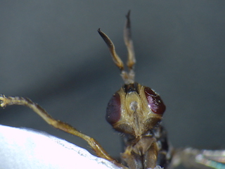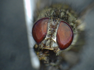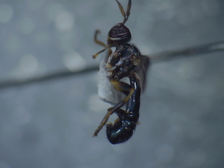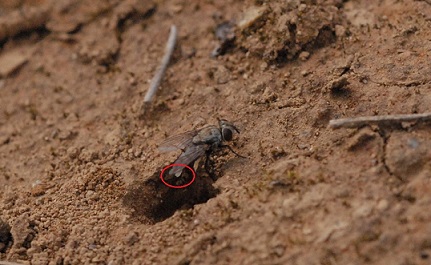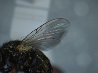どうもです.標本お送りいただきまして,ありがとうございます. このニクバエはタイワンヤドリニクバエ Metopia sauteri (Townsend)の♀と思われます. basicostaとepaulet が黒く,r1 に毛がなく,中脛節にv剛毛がないこと,などから上記と考えます. エサキムカシハナバチの巣ですか.貴重な生態情報ですね. ニクバエとハチの関係は,とても面白いですね. また興味深い情報がありましたら投稿のほう,よろしくお願いします. |