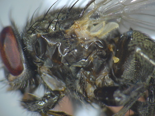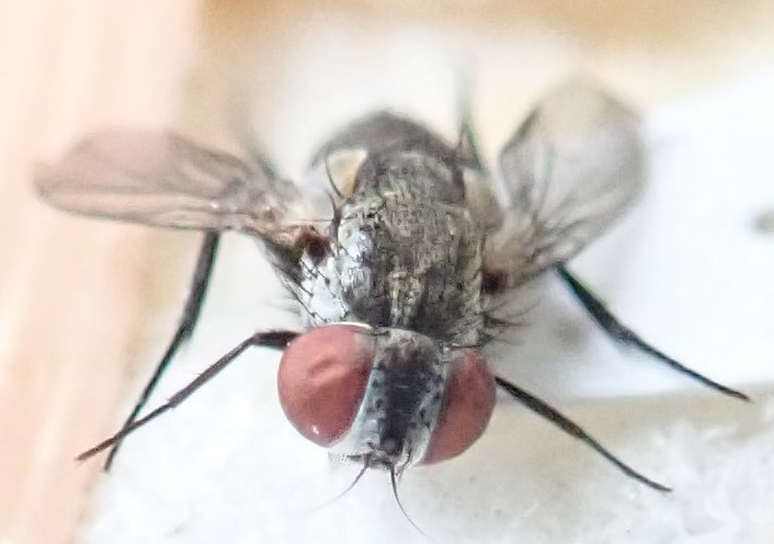 20190916に箱根の阿弥陀寺で採集したキノコ(科/属/種不明... 採集者は僕ではないです...)から幼虫を羽化させ、13個体ほど(♂、♀の数はまだ数えていないです)成虫が得られました。 羽化したのは20190927です。 「日本のイエバエ科」をの検索表を用いたところ、 ウスズミトゲアシイエバエ Phaonia subnigra にたどり着きましたが、詳しい解説を見たところどうも違うようで...。 Fauna japonicaなど、他の文献を見ることでもっと詳細なことがわかると思うのですが、持っていないのでお手上げです...。 ♀の画像を添付いたします。