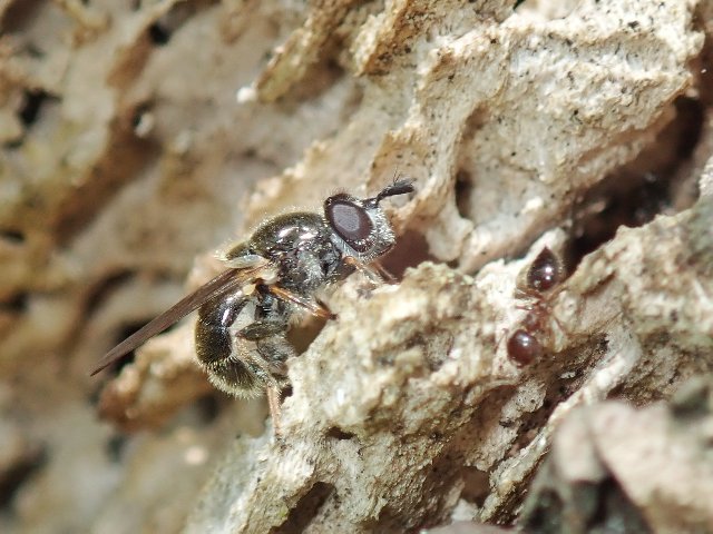 このハナアブは、Syrphus torvus ケヒラタアブです。 この画像でも複眼に毛が生えているのが確認できます。