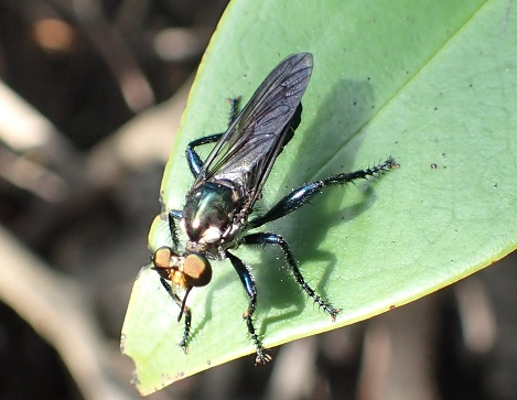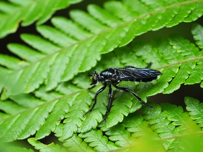 イシアブの一種でしょうか?6月19日に、 徳之島の林道でみつけたムシヒキアブです。 毎年初夏の頃から出だします。 生息する場所や大きさが、 ハラグロオニイシアブと似ています。 暗い緑色をしていて、メタリック。 お腹の部分に白いラインあり。 ネットで検索すると、 奄美大島にも同種と思われるムシヒキアブが分布するようです。 同定よろしくお願いします。