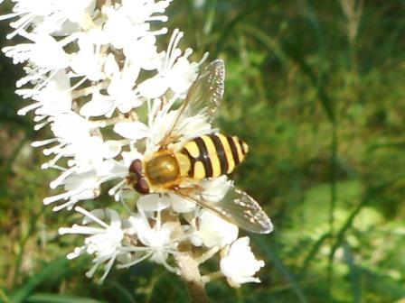 画像のハナアブは、Syrphus属の♀個体です。 この仲間は、数種本州にも分布していますが、この画像の解像度では判定できないのです。 確認には、複眼に立毛があるか否か、翅のbrとbm室の微毛の分布状態などを観察する必要があります。 かなりの大型種に見えるので、おそらくはケヒラタアブかオオフタホシヒラタアブのどちらかと思いますが・・ 同様の話題は、過去ログ1945〜にもありますのでご参照ください。